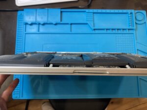 今回お持ち込み頂いた端末は、バッテリーが膨張しており、端末を閉じることが出来ない状態でした。
